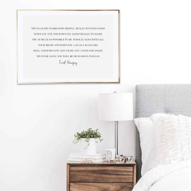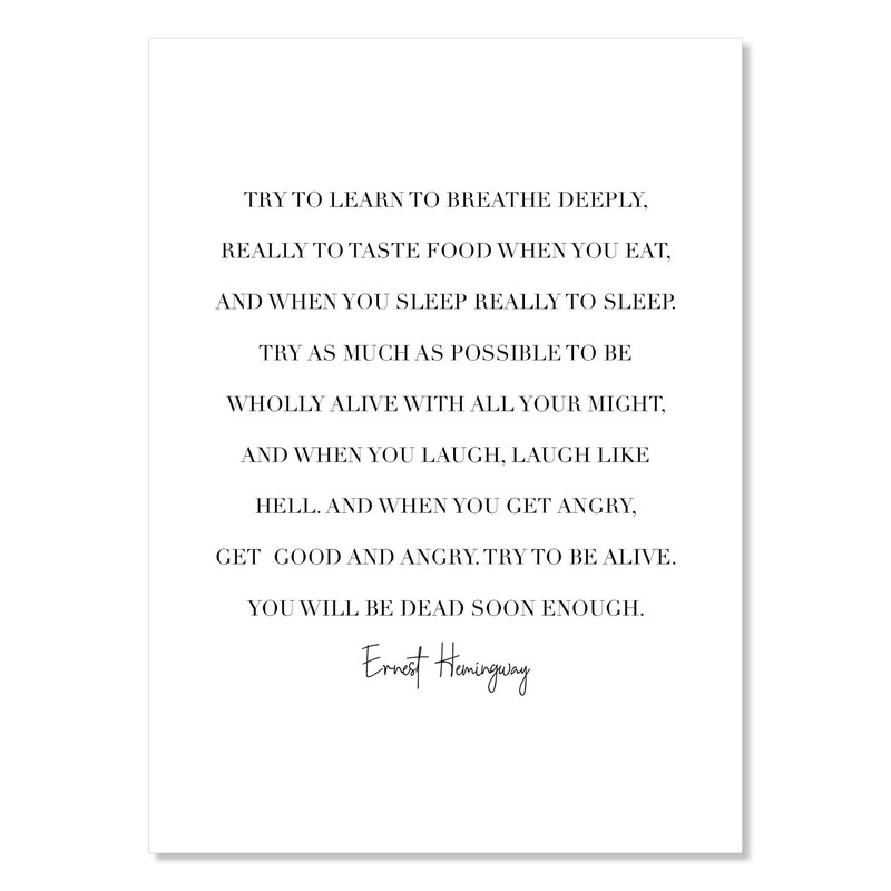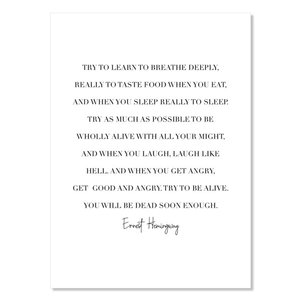 Try to Learn to Breathe Deeply. Really to Taste Food When You Eat -Ernest Hemingway Quote Print, Unframed