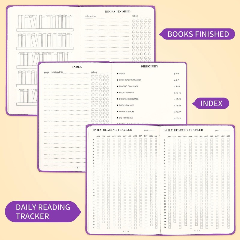 - Multifunctional Design - There is an index preview help you check your reading and rating quickly. Daily reading tracker tracking your reading progress. The challenge of reading inspire you to finish your goals that you set at beginning. Write books you have read and books you borrowed or lent and more.