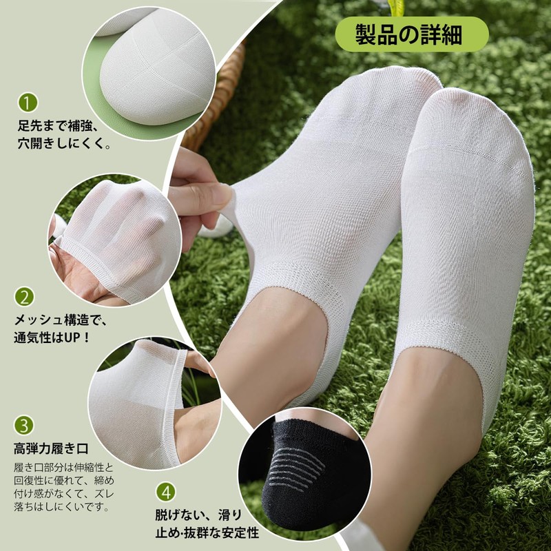 - 4. かかととつま先は厚めで耐摩耗性に優れ、6倍の伸縮性ソックスは跡が残らず、かかとが脱げにくく、毛玉ができにくいです。シリコン製のかかと部分は脱げにくい設計です。植物由来のカラープリントと染色技術は環境に優しく安全で、化学残留物や蛍光剤を含まず、色褪せもなく、肌の健康を守ります。