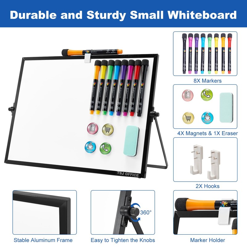 TSJ OFFICE Dry Erase White-Board - 12 X 16 Inches Portable Small Magnetic Whiteboard with Hooks for Wall, Mini Desktop Whiteboard 360 Degrees Revolving Double Sided Stand for Office, Home, School