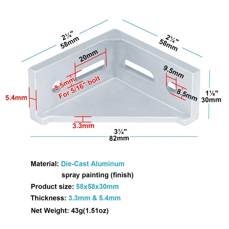 - Aluminium profile connector has 4 mounting holes, angle improves support at the point of the