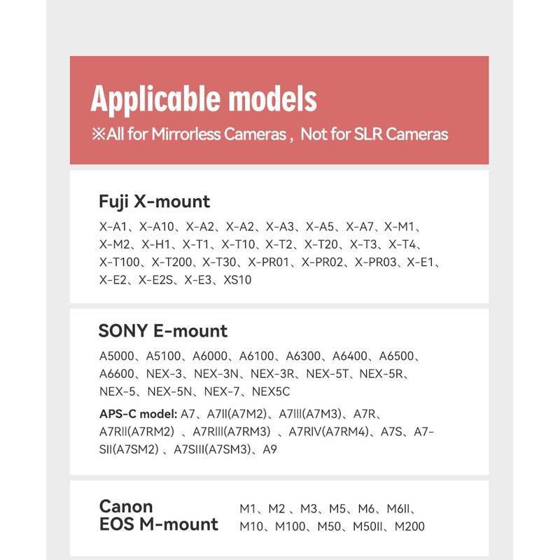 - Compatibility📷 It is compatible with Fuji Fujifilm X FX Mount Cameras X-A1 X-A10 X-A2 X-A3 X-A5 X-H1 X-T1 X-T10 X-T2 X-T20 X-T100 X-PRO2 X-PRO3 X-E1 X-E2 X-E3S