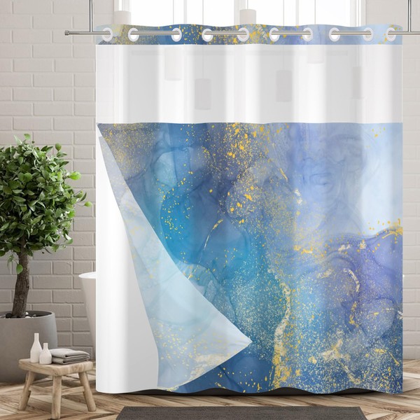 Ttincceer Shower Curtain Waterproof Hookless Design Double Fabric Blue Purple Marble Texture 180 x 188 cm Bathroom Curtain with Privacy Screen Top Window