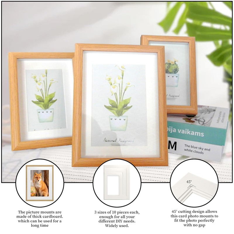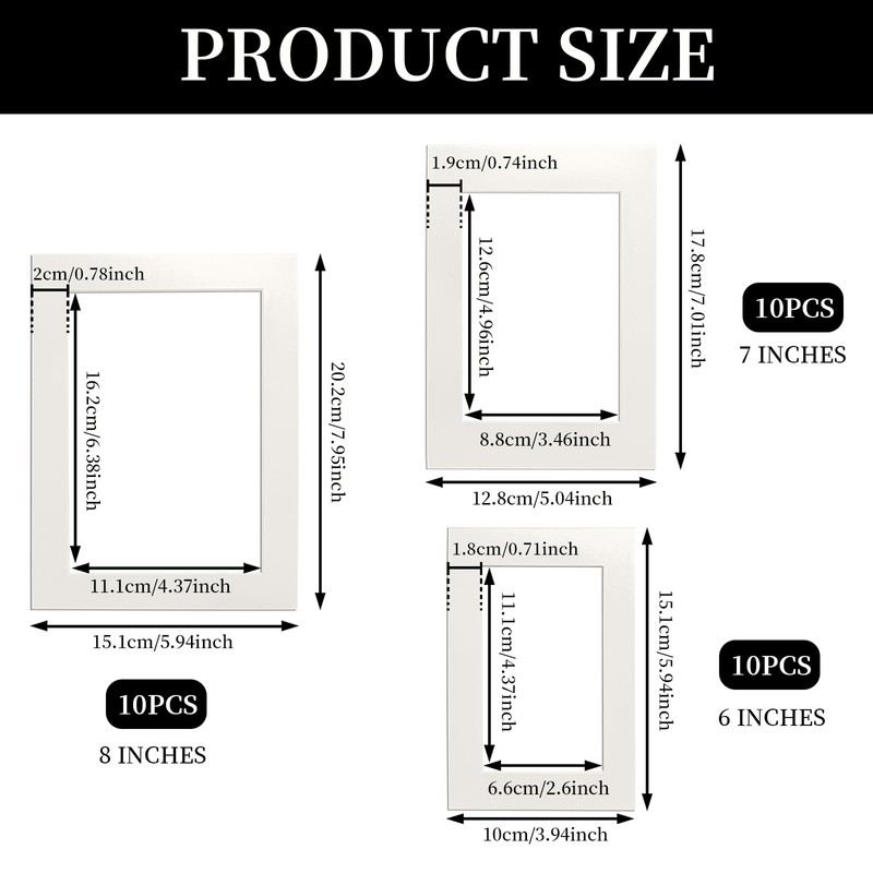 - 3 sizes: the 30 white mount includes 10 pieces with an outer size of 15 x 20 cm, an inner size of 11 x 16 cm; 10 pieces of an outer size of 13 x 18 cm, an inner size of 9 x 13 cm; 10 pieces with an outer size of 10 x 15 cm and one Inner size of 7 * 11 cm