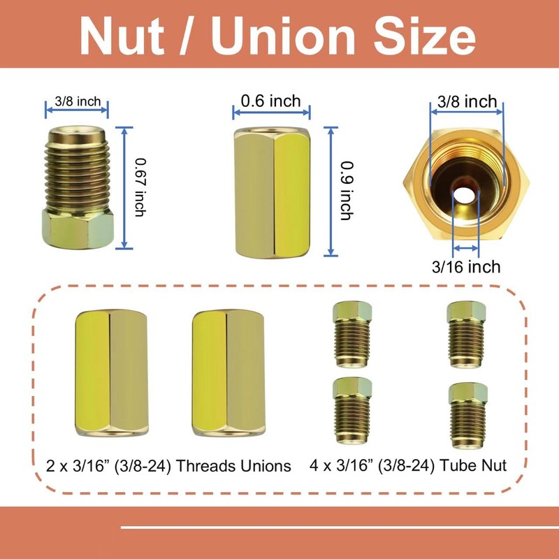 - Universal Compatibility: The 2 unions and 4 nuts fit most standard 3/16" inverted single flare brake lines, making it suitable for a wide range of vehicles including car, truck, ATV, and motorcycle. Perfect for DIY and routine maintenance .