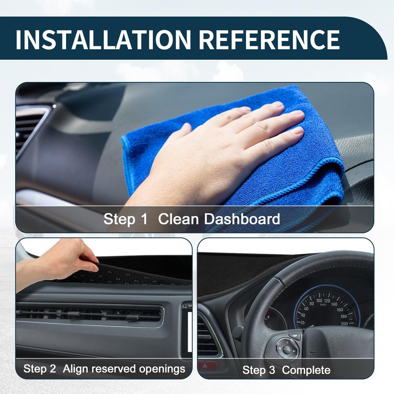 It takes only 3 minutes to install the protective car dashboard cover. Direct installation to fit the openings of the reserved air conditioner exit, speaker, etc.