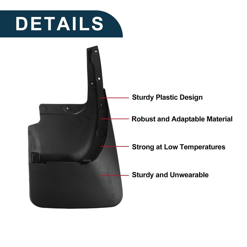 - Product Characteristics: Every mudguard is a good fit for your car. A remarkable fit is ensured by the design's ability to hug the contours of your vehicle like no other.