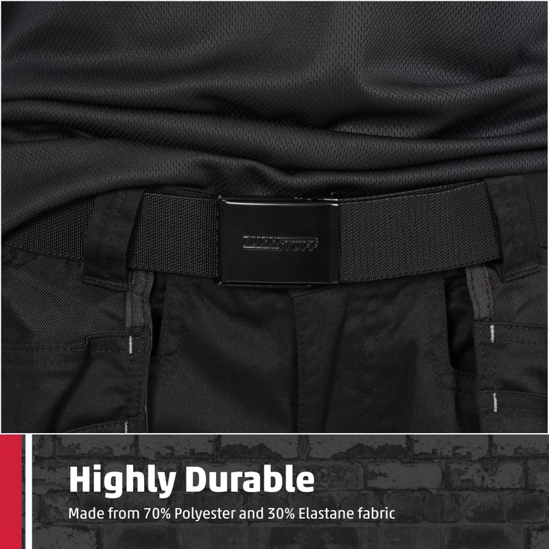 - PROFLEX BELT - The TuffStuff Proflex Belt is your essential workwear companion. It features a robust, webbed woven strap that adapts to your movements, providing all-day comfort without compromising on strength. (Colour: Black, Size: One Size - Universal Fit, Length of Belt Unravelled: 125cm)