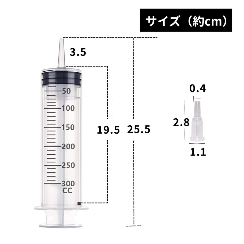 - 大きいサイズで使いやすい、300mlの大容量シリンジです。目盛りの文字も見やすく使い勝手◎