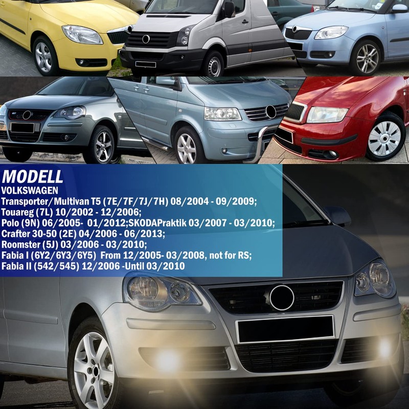 - Installation replacement for: VW Transporter/Multivan T5 (7E/7F/7J/7H) 08/2004-09/2009; Touareg (7L) 10/2002 - 12/2006; Polo (9N) 06/2005-01/2012; Crafter 30-50 (E2E) 04/2006-06/2013; Skoda Praktik 03/2 007- 03/2010; Roomster (5J) 03/2006 - 03/2010; Fabia I (6Y2/6Y3/6Y5) 12/20005- 03/200 08, not for RS; Fabia II (542/545) 12/2006 - 03/2010; fog lights sold in pairs