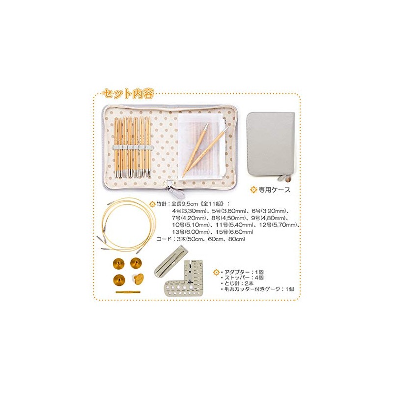 • Set Includes: 11 pairs of bamboo needles 4 (3.30mm), 5 (3.60mm), 6 (3.90mm), 7 (4.20mm), 8 (4.50mm), 9 (4.80mm), 10 (5.10mm), 11 (5.40mm), 12 (5.70mm), 13 (6.0mm). No. 5 (6. 60mm), 3 Cords (50cm, 60cm, 80cm), 1 Adapter, 4 Stoppers, 2 Needle Gauges with Yarn Cutter, Case