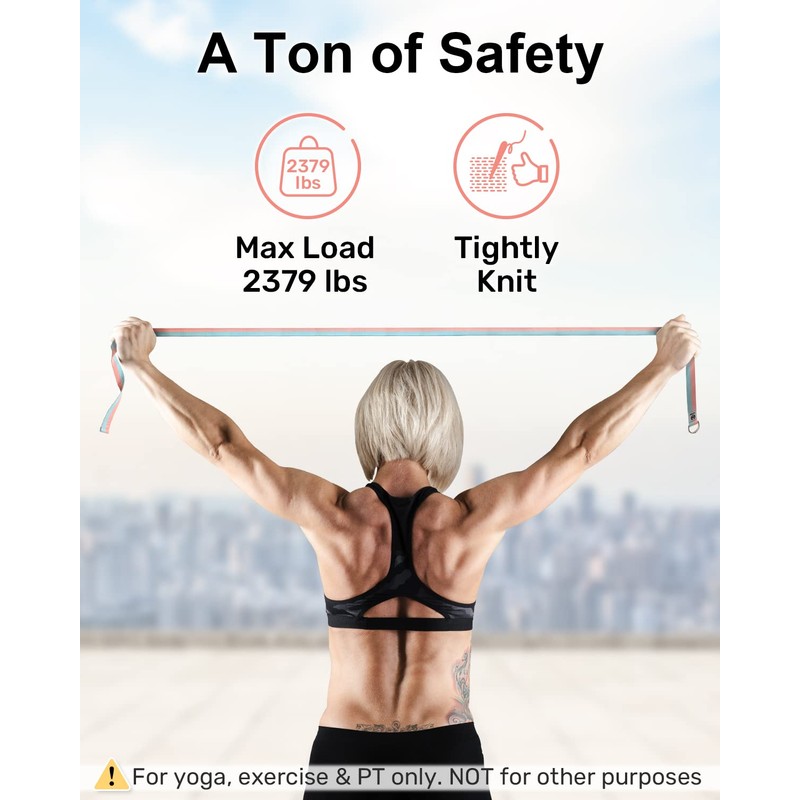 - ◆【A Ton of Safety】- It's literally a ton! The maximum load of our yoga belt is "2,379 lbs (1.079 ton)", safe enough for stretching, yoga, therapy, and all types of workout. ⚠️The strap is designed for yoga, exercise, PT using. We do NOT recommend using it for other purposes. ⚠️