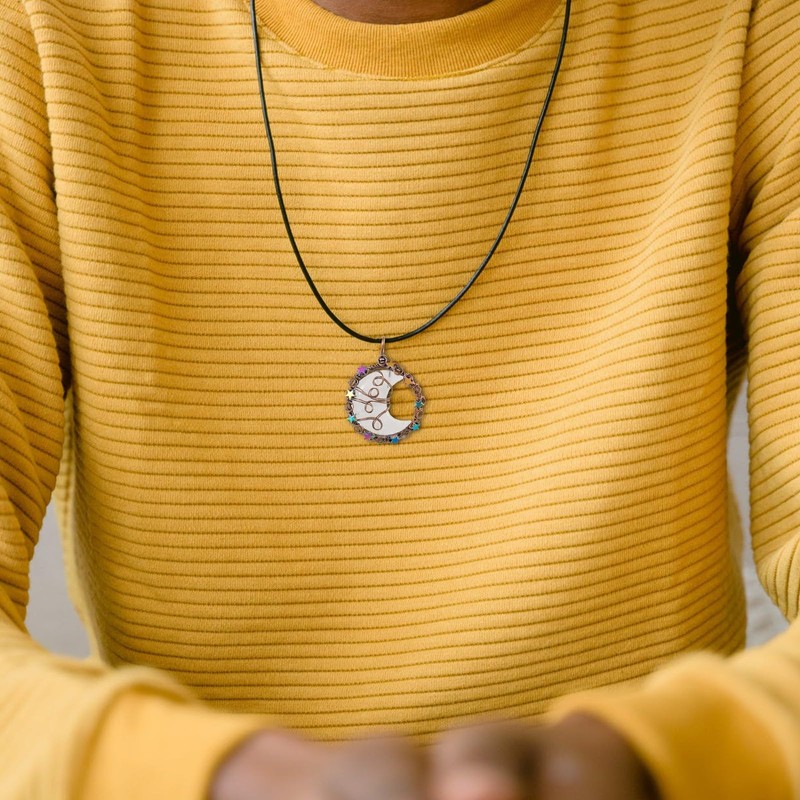 - Half Moon Crystal Necklace: Made of Rock Quartz, the crescent moon shaped pendant is wrapped by copper wires and secured on the circular ring. Titanium coated stars made of hematite are wrapped around the ring, highlighting the delicacy of the moon stone. Due to the uniqueness of crystals, you will receive pendant similar to the picture but unique