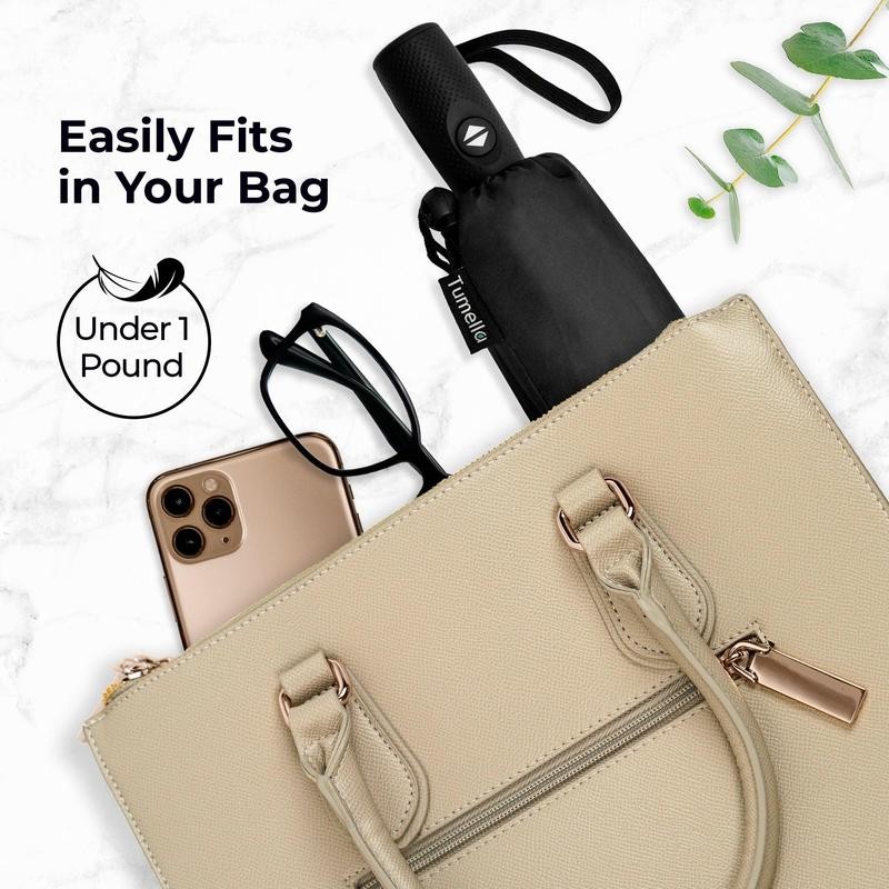 - LIGHTWEIGHT, EASY ONE-HANDED USE, SMALL & PORTABLE: Take this compact umbrella for travel with you wherever you go. So versatile and simple to use, with just the touch of a button, you can automatically open or close your Tumella. It fits perfectly in your backpack, purse, or car door, with just 11 by 2.75 inches in size, weights less than 1 lb, while offering a huge coverage of 42 inch.