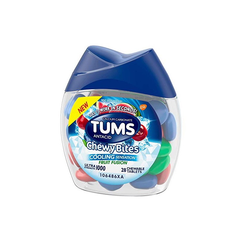 • Contents: 28 TUMS Chewy Bites Cooling Sensation Ultra Strength Antacid Chews for Heartburn Relief in fruit fusion flavors
