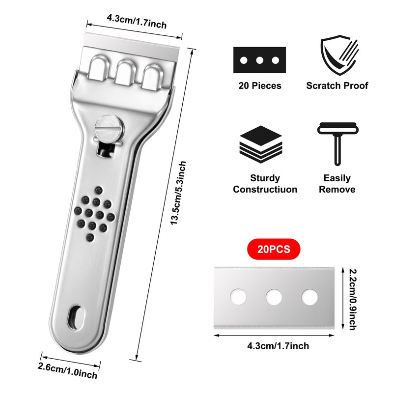 Tunejoy Ceramic Hob Scraper Stainless Steel Glass Scraper Hob Scraper Metal with 20 Replacement Blades for Cleaning Oven Cooker Scratch Removal