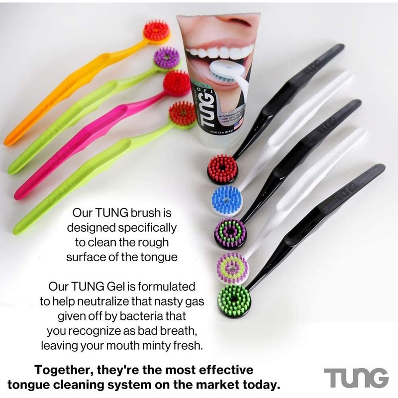 - NEVER FEEL ANXIOUS ABOUT BAD BREATH AGAIN: Fact: you can't smell your own breath. Don't get caught not knowing! If you ever have lingering doubts about the freshness of your breath, The Original TUNG Brush and TUNG Gel will give you complete confidence. Be confident knowing that TUNG has your back. WATCH OUR INFO VIDEO LOCATED IN OUR IMAGES TO LEARN THE FACTS. Brush your tongue for confidence. In just ten seconds, you can remove the odor-causing microbes in your mouth & feel fresh.