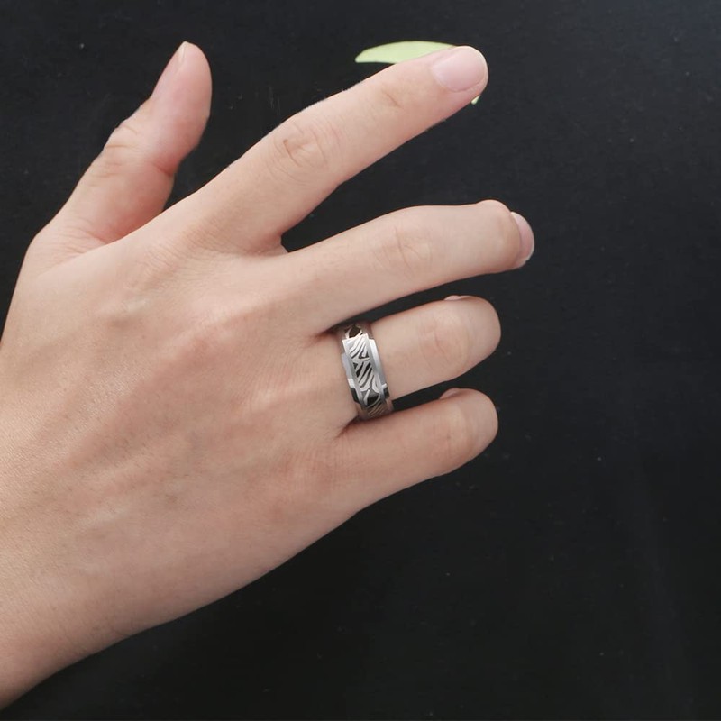 The wedding ring has a damascus steel pattern and two straps with brushed finish and polished bevelled edges, shiny inside, smooth and comfortable fit. This special combination is eye-catching, thanks to the comfortable interior and beautiful weight, it is comfortable to wear and suitable for most occasions of daily life.