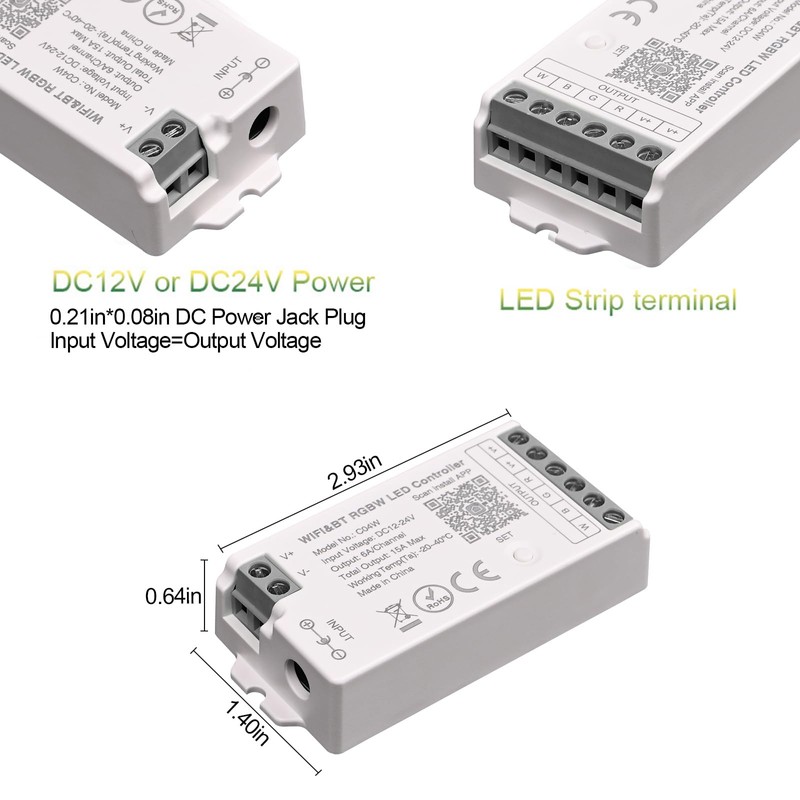 - PWM LED type: control of RGBW LED strips, LED string LED bulb such as FCOB 5630 2835 3528 5630 5730 5050 3014 etc. Without IC chip V+ red, green, blue, white 5-core LED strip. Power: 6A/Channel Total power: max. 15A. DC12V 180W max. DC24V 360W max.