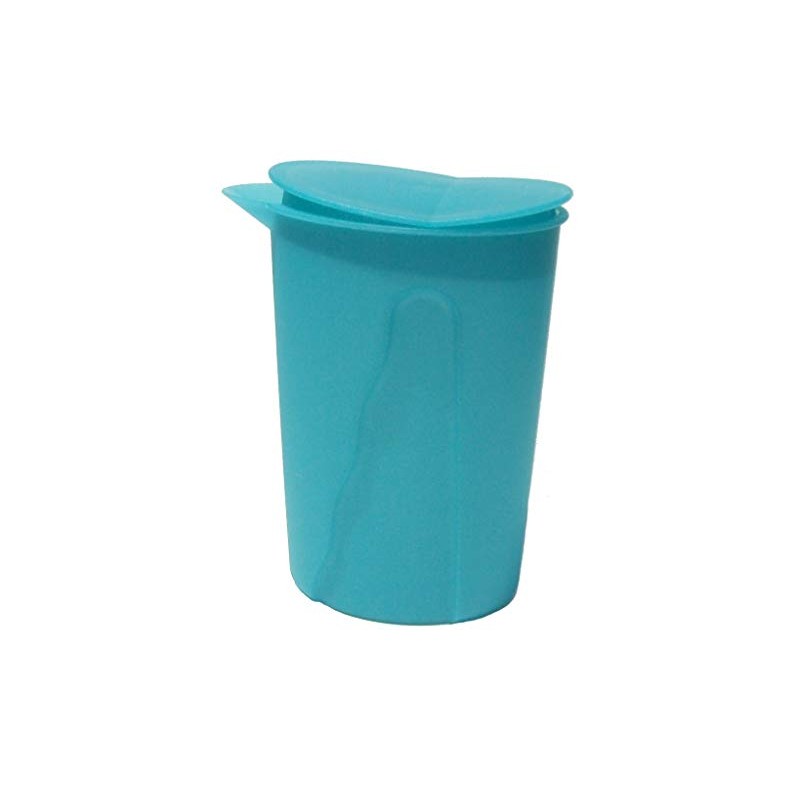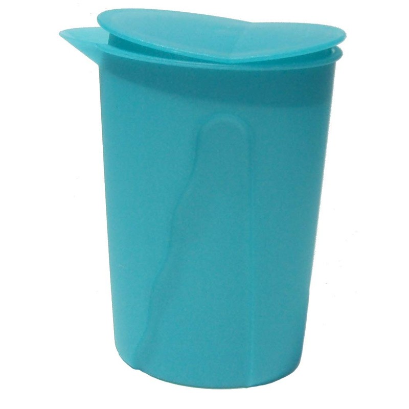 Tupperware Impressions small slim line 1 quart pitcher. Color is sky blue. Small size pitcher, designed to fit in the door of most refrigerators. Stands approximately 7 1/2 inches high by 6 inches from spout to opposite side by 3 1/2 inches wide. Dishwasher safe and BPA-free.