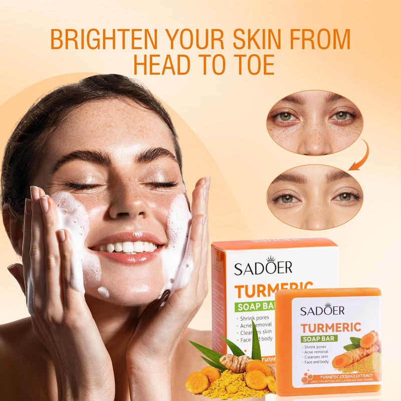 - 【Universal Suitability】: Our Turmeric soap is mild and hydrating, very suitble for all skin types. It could cleanse effectively and helps prevent comedones and acne, making it suitable for a wide range of individuals seeking clear, healthy skin.
