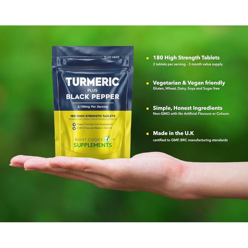 Looking for a High Strength Turmeric and Black Pepper supplement? Our tablets are made of the highest quality ingredients with minimal binding ingredients in the UK. Right Choice Supplements Turmeric with Black Pepper tablets are free from any kind of additives, harmful ingredients, chemicals, allergens, etc. and safe to be used by everyone. Affordable Price, Optimal Health: We provide an affordable option in minimal, letterbox friendly packaging. Easy to store and take with you wherever you go. Click on the button and add the supplement to your cart today.