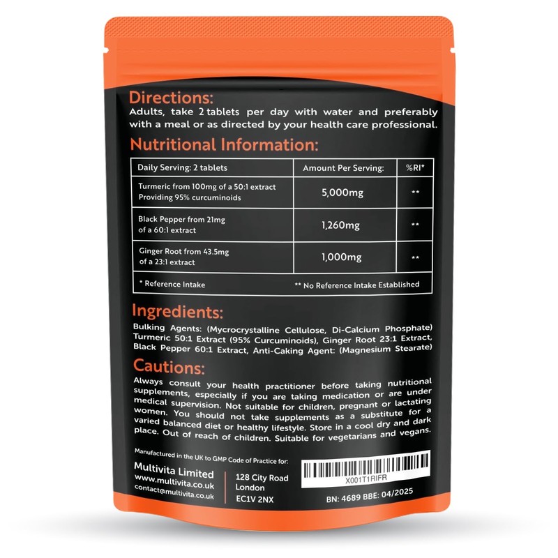 - ✔ GREAT VALUE FOR MONEY - 2 months supply by taking the recommended daily dose of 2 tablets per day. By providing our turmeric tablets in flat pack packaging, we save on costly postage and storage fees associated with bottled turmeric capsules. Savings are passed on to our customers and allows us to spend more on research, helping us provide our loyal customers with quality products at great value prices