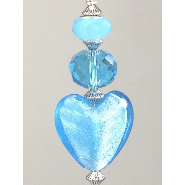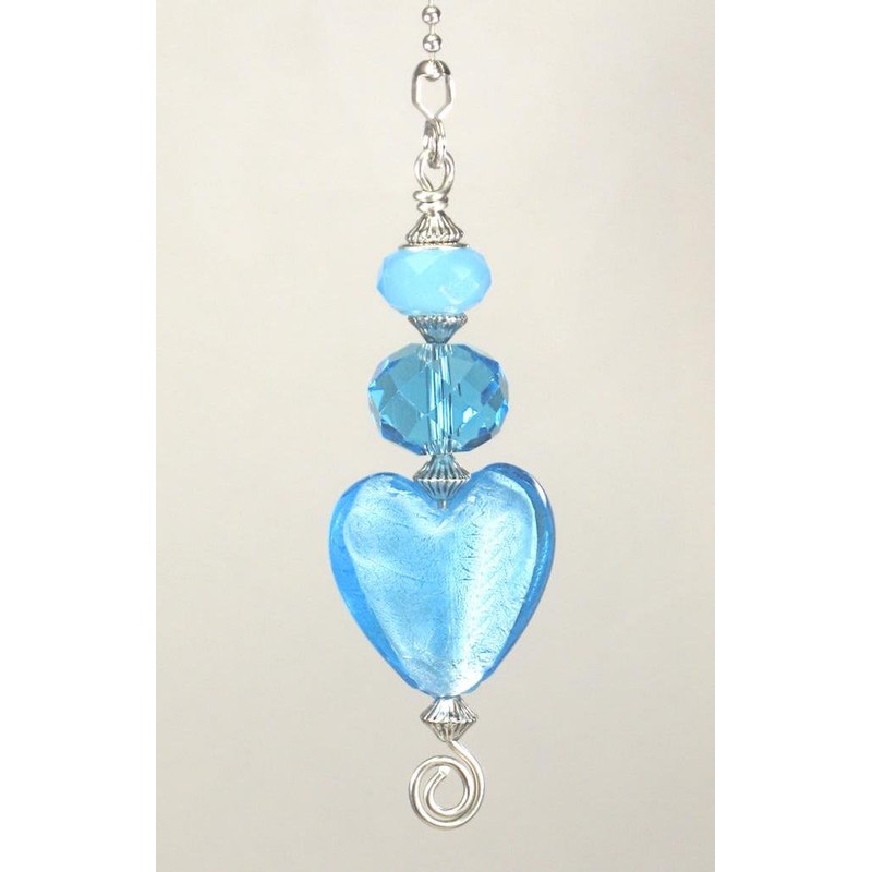 Large Turquoise Blue Glass Heart with Silvery Accents Ceiling Fan Pull Chain. Decorative ceiling fan pull chain ornament for light and/or fan chain ends or for light pull chains. Pull is 3 1/2 inches long. Extra 5-inch long attached chain included easily snaps on or off to end connectors.