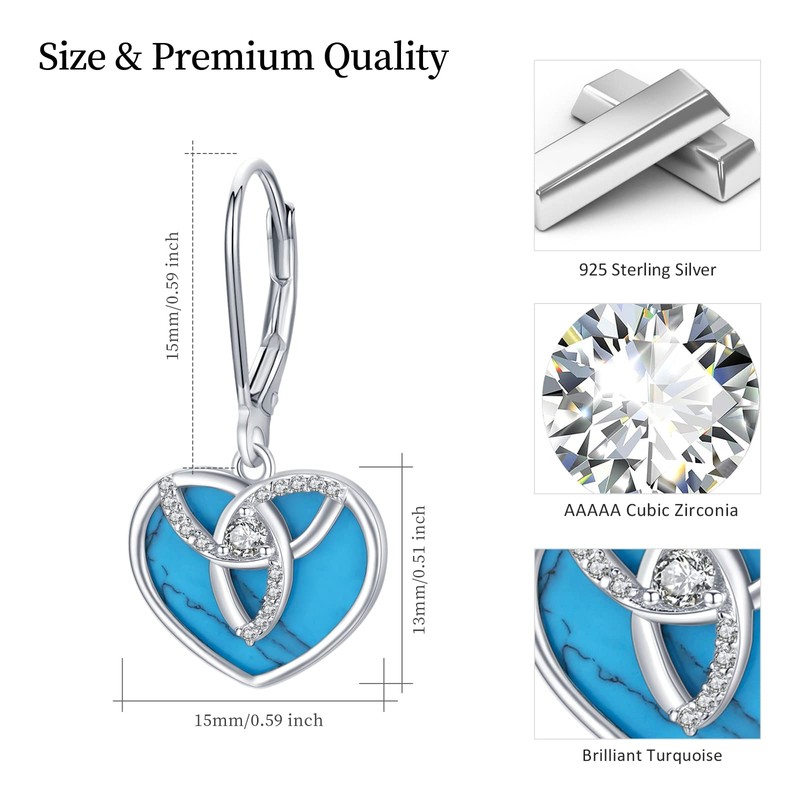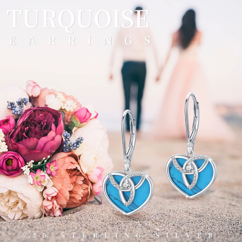 - Turquoise heart earrings: Turquoise symbolises happiness, power and status, wealth. These beautiful 925 silver turquoise earrings with dangling latch back radiate a charming romantic retro style and a bright splash of colour that is sure to be your new favourite accessory.