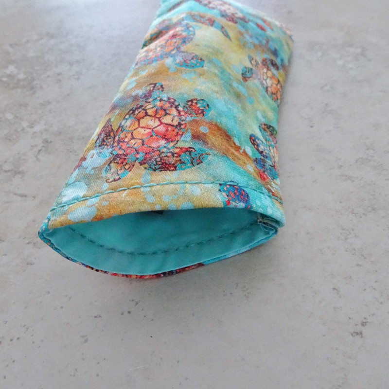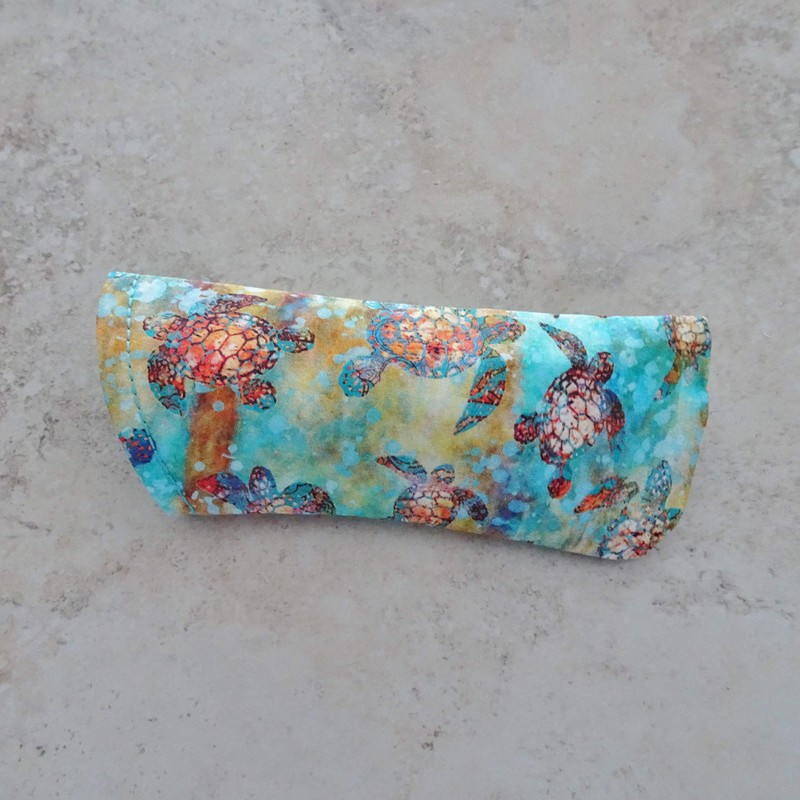 Eyeglass case is made up in a lovely turquoise blue batik cotton fabric design featuring images of sea turtles in the pattern. The contoured design will be a nice fit around your sunglasses or eyeglasses protecting them from scratches. Case is lined with an turquoise cotton fabric and interfaced to give the case good body. Measurement is 7" x 3" . Placement of fabric design may vary from photo depending on the cut of the fabric. Glasses pictured are for demo of size and use of case and not included.