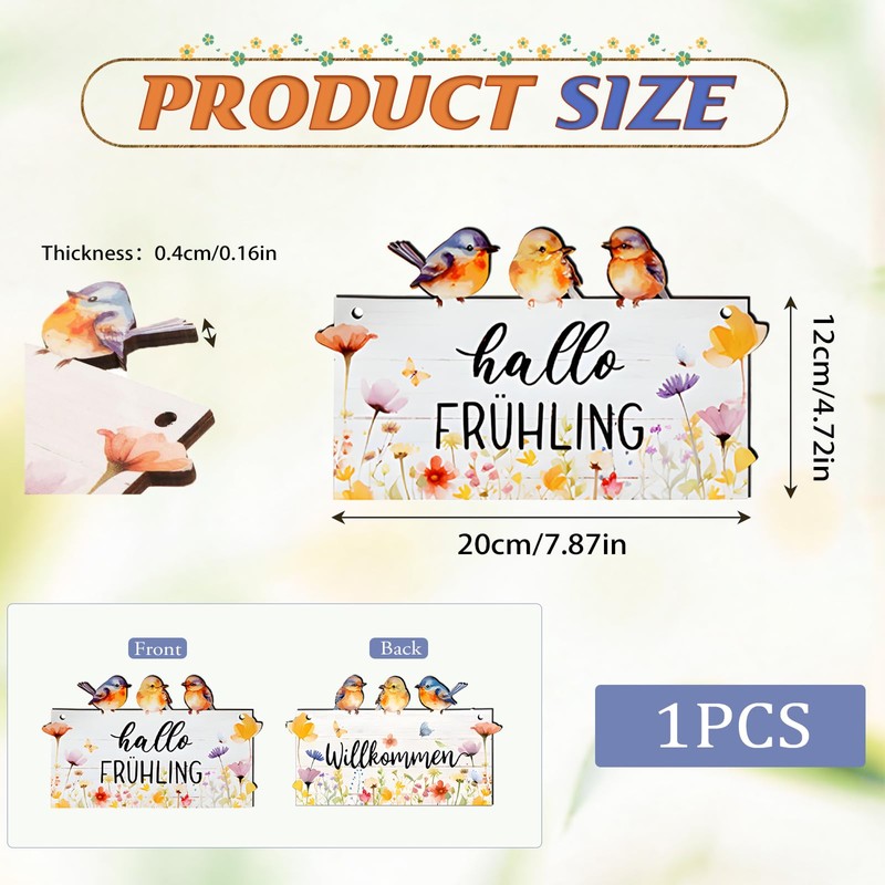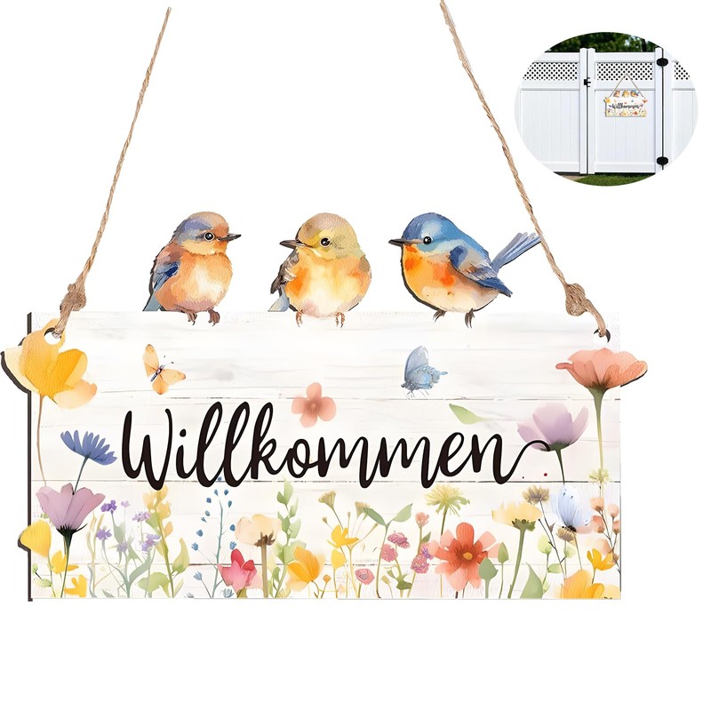 Die natürliche Farbgebung, das verspielte Motiv und das beidseitige Design machen es zum echten Hingucker, ohne aufdringlich zu wirken. Ob als Frühlingsgruß, Osterdeko oder täglicher Willkommensgruß – das Schild sorgt zuverlässig für warme Atmosphäre.