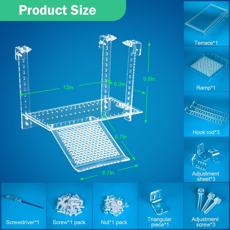 - 📏 Height-Adjustable for Every Water Level – Easily modify the platform height with our flexible hook system. Whether your waterline is high or low, this large turtle basking platform ensures your pet has a dry, spacious area for lounging, essential for shell health and UV basking needs.