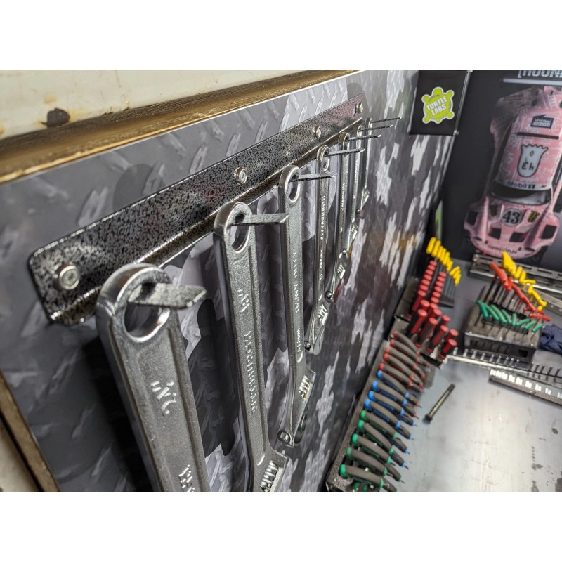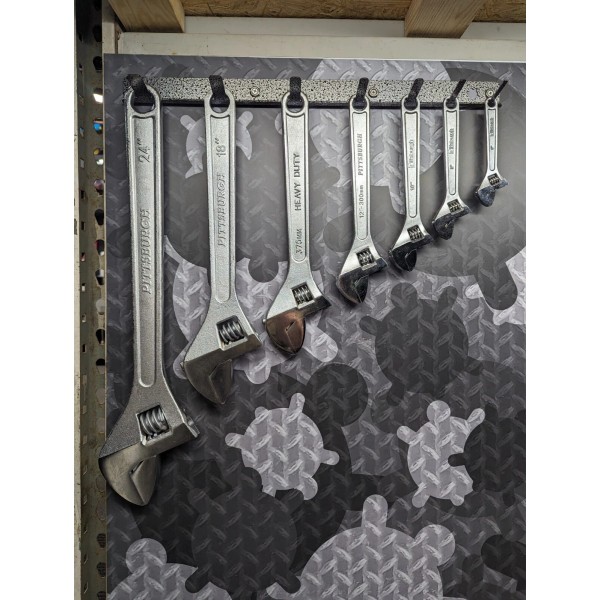 If you want to display your adjustable wrenches on the wall of your shop, or back drop to your workbench, this hanger will do just that. It evenly spaces them out to not only store them, but display them in an aesthetically pleasing manner!