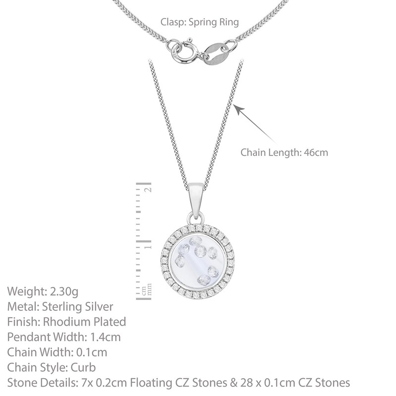 Tuscany Silver Rhodium Plated Floating Cubic Zirconia Stones Round Pendant on Curb Chain of 46 cm/18-inch