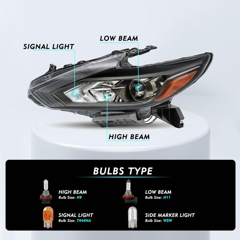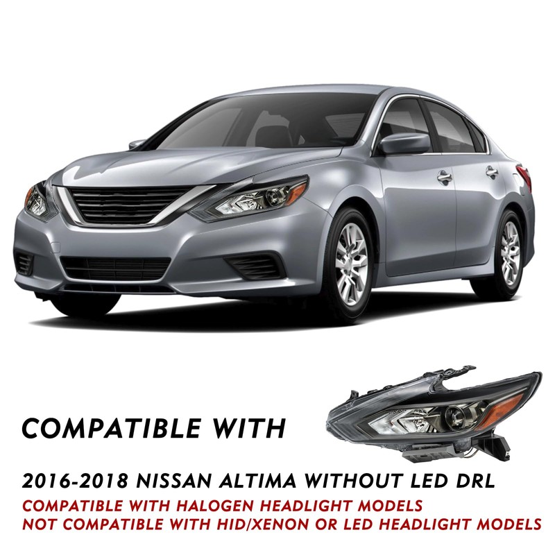 - 【SUITABLE MODELS】Black Headlights Compatible with 2016 2017 2018 Nissan Altima. Only Fit Halogen Headlamps Models. Don't fit Headlamps Models with LED DRL. High beam bulb type: H9; Low beam bulb type: H11. Bulbs are not included.