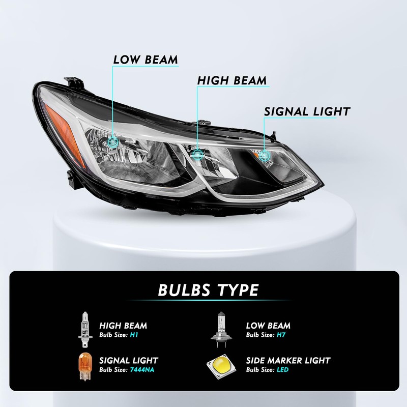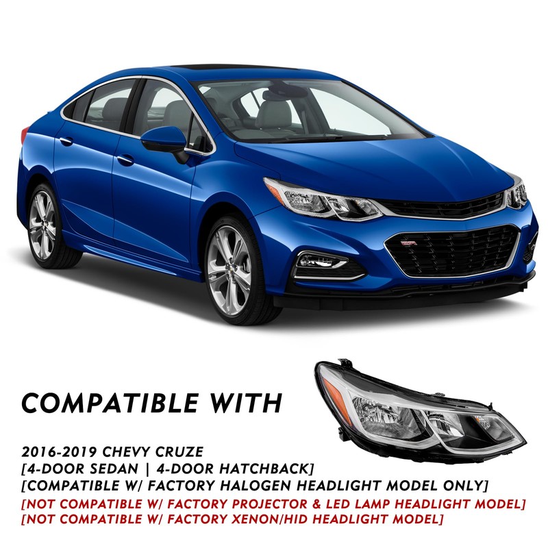 - ✅ 【SUITABLE MODELS】Headlights Assembly Compatible with 2016 2017 2018 2019 2016-2019 Chevrolet Cruze Halogen Model. Only Fits Factory Halogen Headlight Model. Not Compatible w/ Factory Projector & LED Lamp Headlight Model. Not Compatible w/ Factory Xenon/HID Headlight Model. High beam bulb type: H1(Not Included); low beam bulb type: H7(Not Included). Signal Light: 7444NA(Not Included). Side Marker Light:LED(Included).
