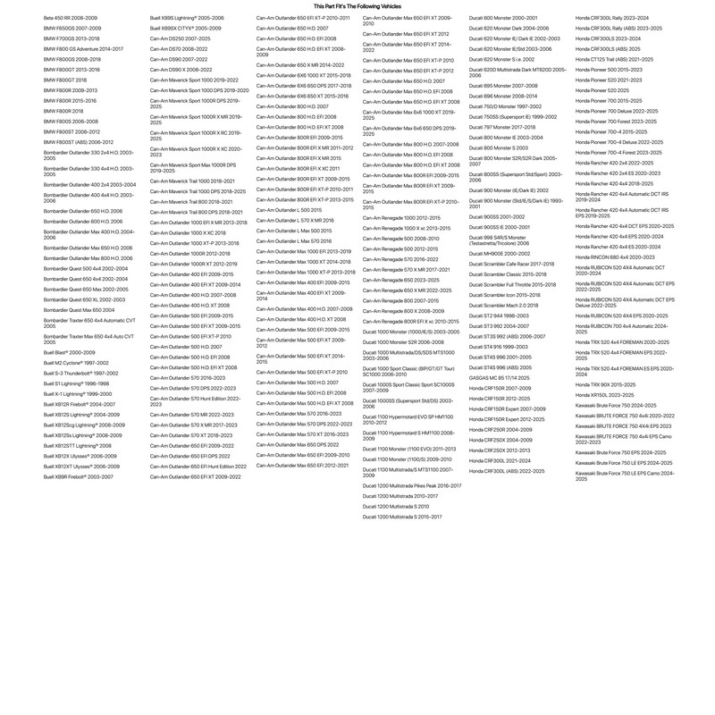 - For use on models like the CRF450/250, TRX450R, YZ/WR250f/400f/426f/450f, YFZ450, DRZ400, KLX300, and more.