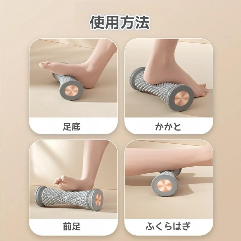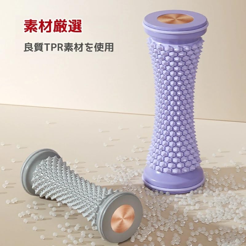 - ちょうどいい感じに足つぼを刺激するフットケア用品です。立ち仕事、ハイヒール、ジムでのトレーニングなどで溜まった乳酸や脚のうっ血を軽減し、素早い回復と痛みの緩和、疲労の解消に役立つマッサージローラーです。扁平足の方、足裏が冷たい方、足裏の筋肉の緊張でお悩みの方におすすめです。また前腕のマッサージにも使用できます。家事で手首に悩みを抱える主婦の方にもおすすめのマッサージ ローラーです。