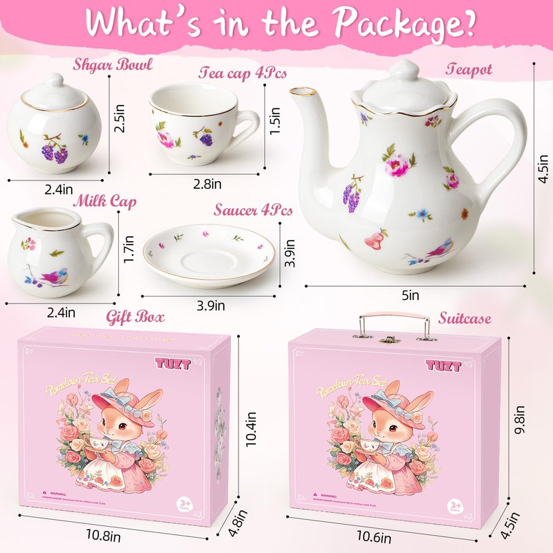 - Delightful Porcelain Tea Set for Little Girls - Our delicate tea set for girls 6-8 includes a pink carry case, a teapot with a lid, 4 matching cups and saucers, a sugar bowl, and a milk cap - 13 pieces in total. All the tea things are hand-glazed with rurality-themed patterns, which match the vibe of outdoor activities. Every girl will love this elegant tea set that offers hours of imaginative play and fun