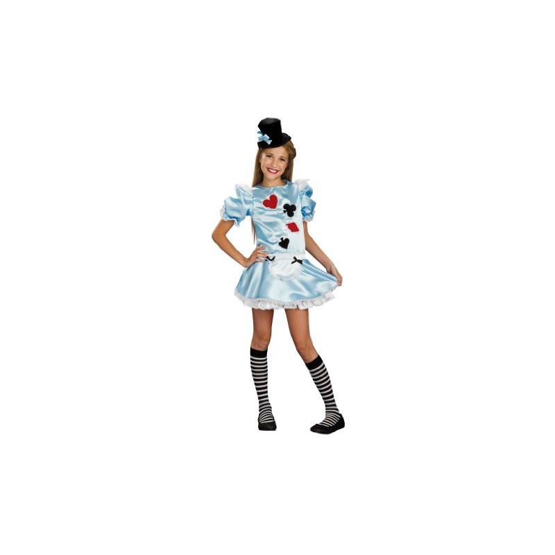 Alice all dressed up for the Queen of Hearts of tea party with satiny powder blue mini dress decorated with heart, club, diamond and spade. Mini hat also included. Tween Small fits dress sizes o to 2; Medium fits 2 to 4. Rubie's Costume Company has been making costumes for more than 60 years. We partner with the best movie studios and television productions to bring you the most popular and the widest breadth of characters. Look for Rubie's costumes for kids of all ages, as well as wigs, masks, accessories, everyday dress-up, pet- costumes, seasonal decor and theatrical make-up.