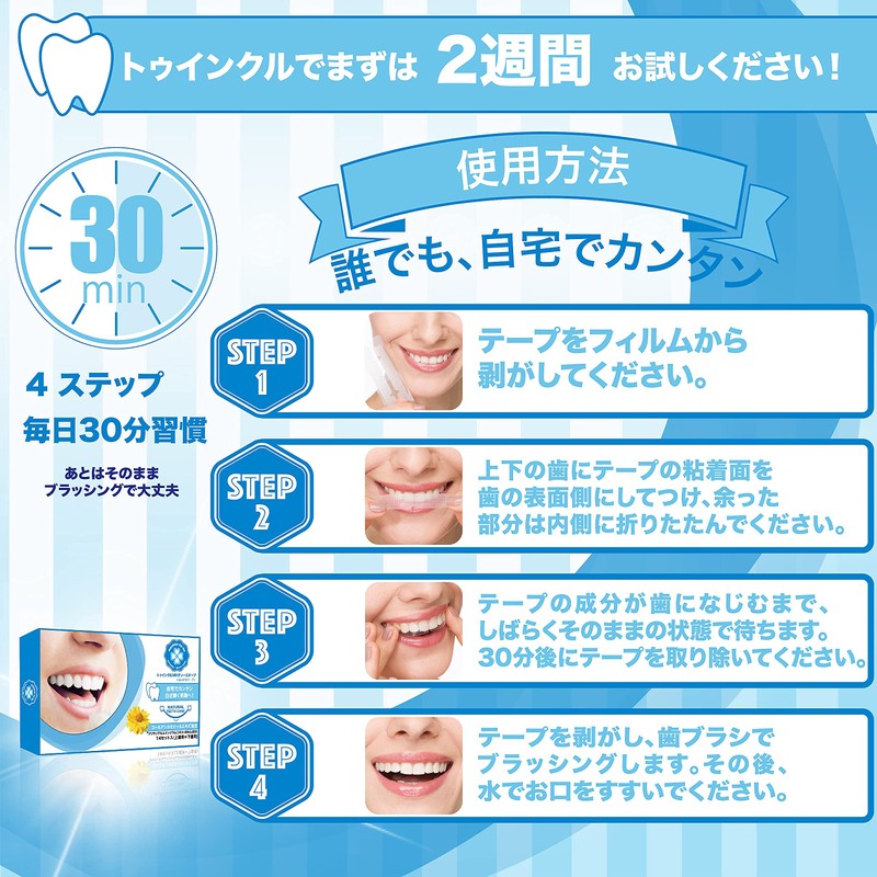 - How to use whitening sheets: How to use Twinkle 1. Peel off the film from the tape and stick the tape to the upper and lower teeth. 2. Place the time until the material of the tape blends in (about 30 minutes). 3. Peel off the tape and brush with a toothbrush (you can use your own toothpaste) 4. Finally, rinse your mouth well and done. Use home whitening (self-whitening) to make it easier to whiten your teeth at home. The teeth are very visible in the face. The color of the teeth, and the color of the teeth is natural in the eyes. With 30 minutes of intensive care for your teeth and eggplant. If you change the kneaded powder that you always use to a soft and soothing aguri powder, you can expect an even more fluffy across!