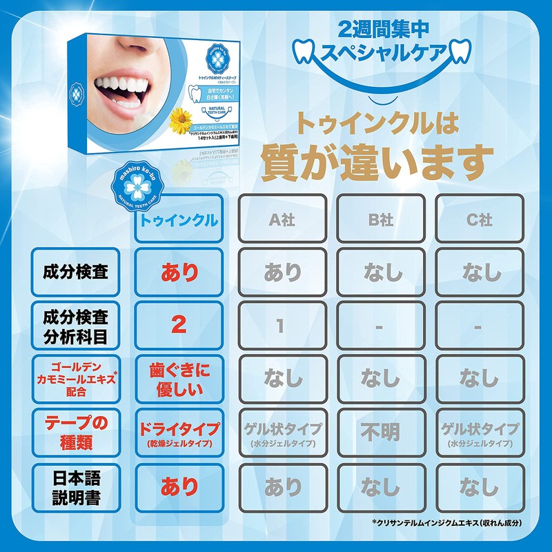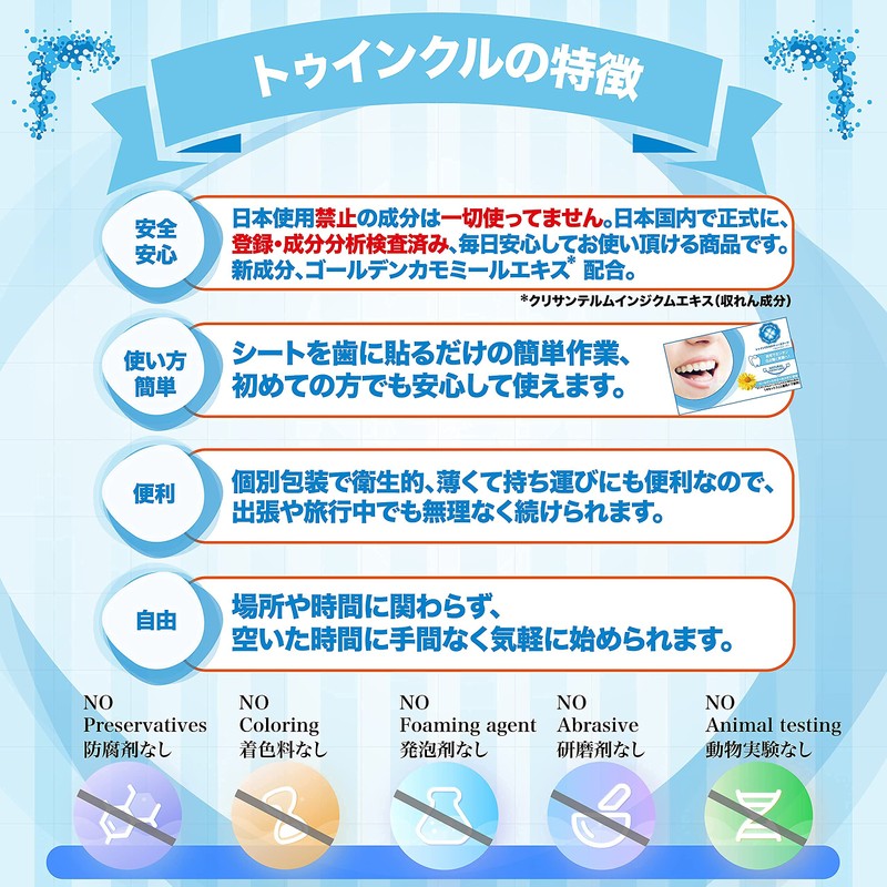 - ✅【Do you love coffee, cigarette, wine? For those who like coffee, tobacco, wine, etc. that are said to cause teeth yellow stains and bad breath, we would like to use a whitening sheet. Twinkle has been registered and tested in Japan, and is formulated with golden chamomile extract that is gentle on the gums and is made using a dry type that makes it easy to penetrate the ingredients. Easy self-whitening (home whitening) with Twinkle for easy 30 minutes of application once and for a new and whitening habit