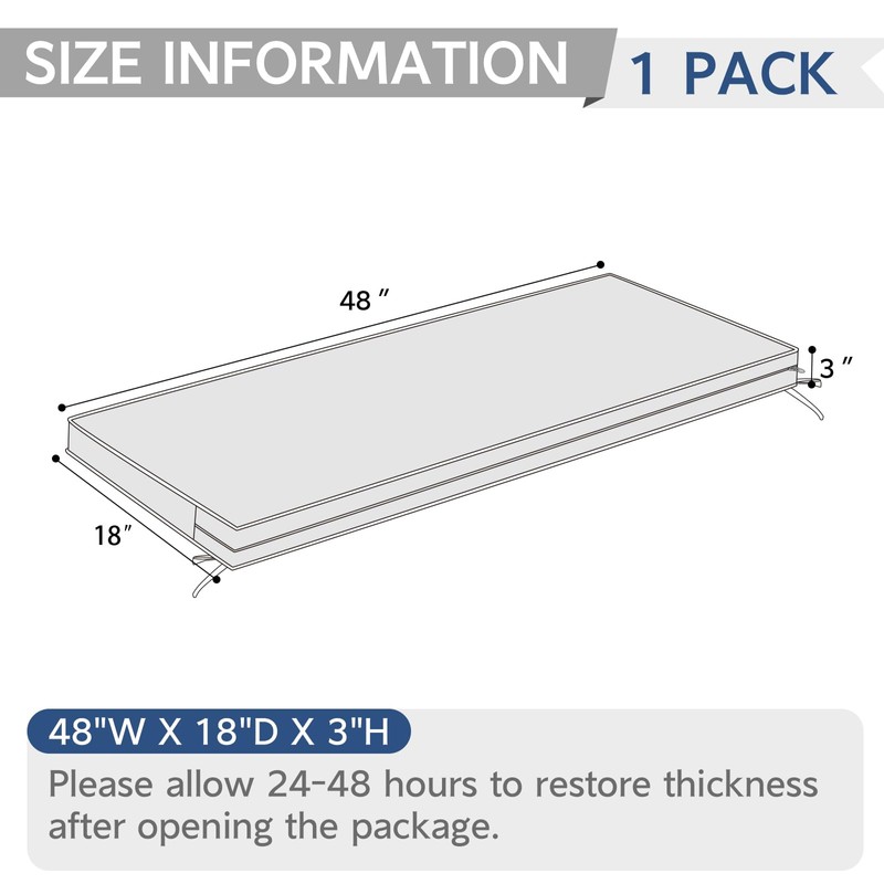 Package Included: 1 piece 48” x 18” x 3” outdoor couch cushion, come vacuum-packaged, please give it some time to expand to the desired size.