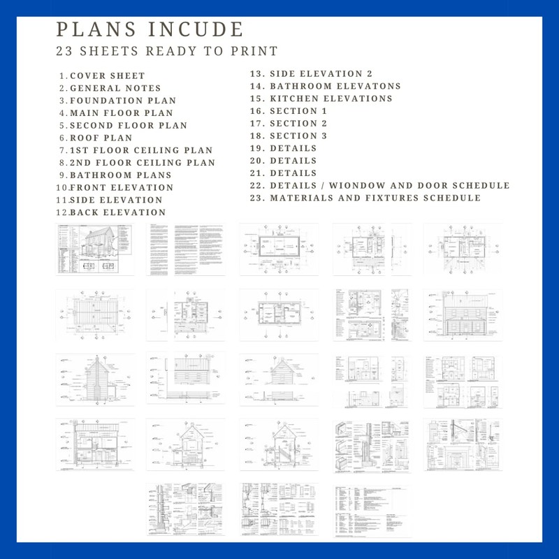 - Complete package with foundation, floor, roof plans, elevations, sections, and schedules