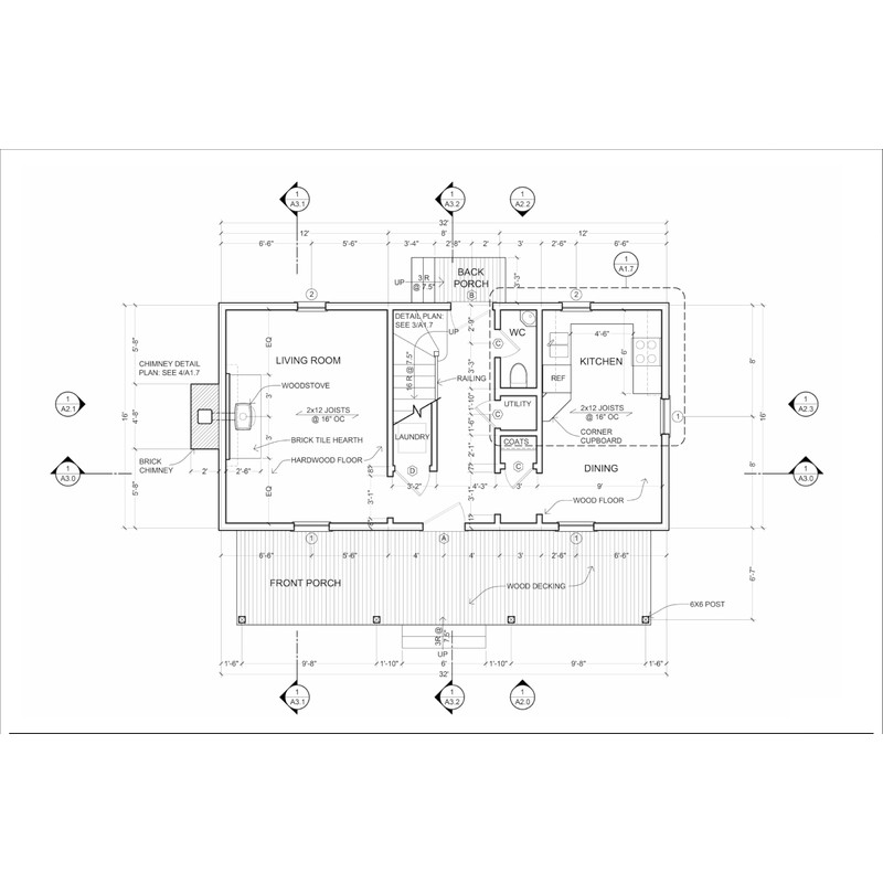 - Includes front and back porch, wood stove, stairs, and comprehensive interior plans