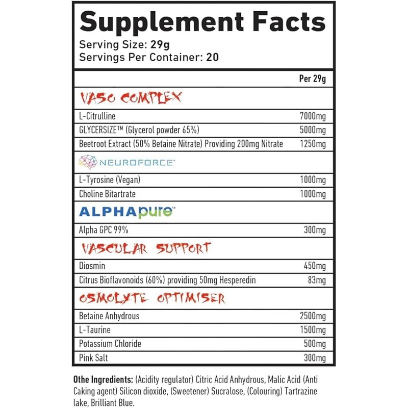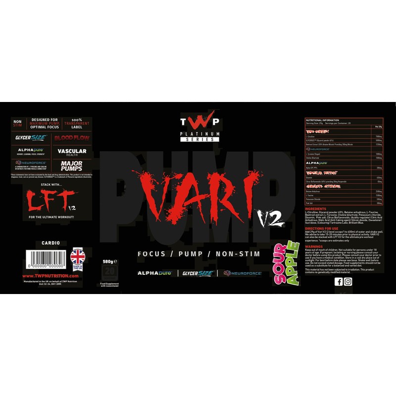 The NEW and IMPROVED VARICOSE V2! Need we go on........... let's do that. A formula that has every intention of being the most comprehensive, highly dosed vaso pump product on the market, where no compromise has been made on quality and every effort concerted, to ensure we deliver the most ridiculous pumps during your workout. Add to that a combination of nootropic agents and an unparalleled flavouring system, to keep that mind-muscle connection on point and those tastebuds wanting more. Of course, Vari V2 can be used as a phenomenal standalone for those who don't have the need for stims or those perhaps training late, however, combine with LFT V2 and take your workouts to the next level! (Vari V2 carries incredibly high dosages, many of the ingredients are hygroscopic. As such, in some instances, a waxy condition and clumping of the powder can occur. This bears no detriment on the quality of the product and will disperse and mix easily once added to water). Please note: Vari V2 carries incredibly high dosages. As such a waxy condition and clumping of the powder can occur. This bears no detriment on the quality of the product and will disperse and mix easily once added to water.