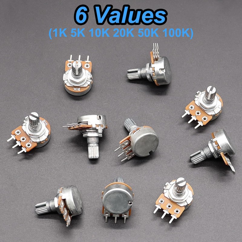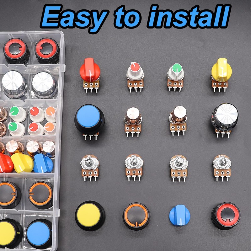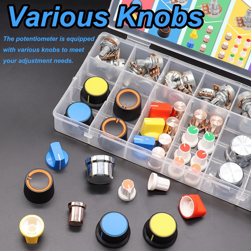 - Product include: 18 x Potentiometer(each Value 3pcs) + 18 x Nut + 18 x Washer + 23 x Knob + 1 x Storage Box