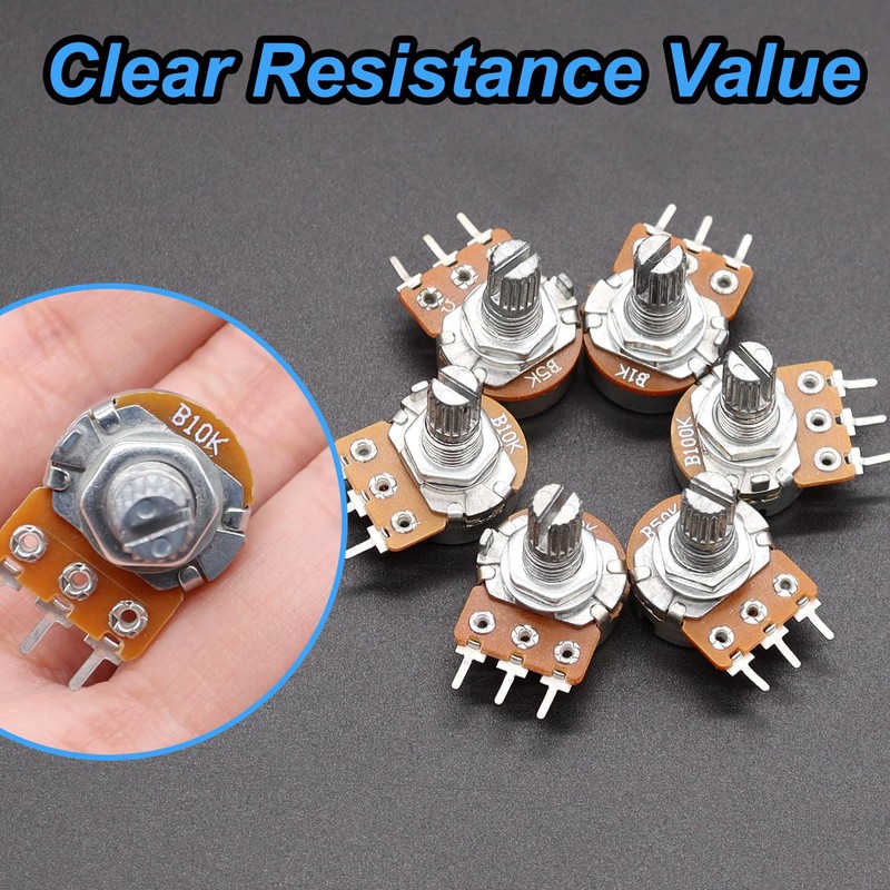 - Product features: The resistance value is clearly marked and easy to identify.Potentiometer material: metal and carbon film; Knob material: plastic and aluminum alloy;Terminals: 3.