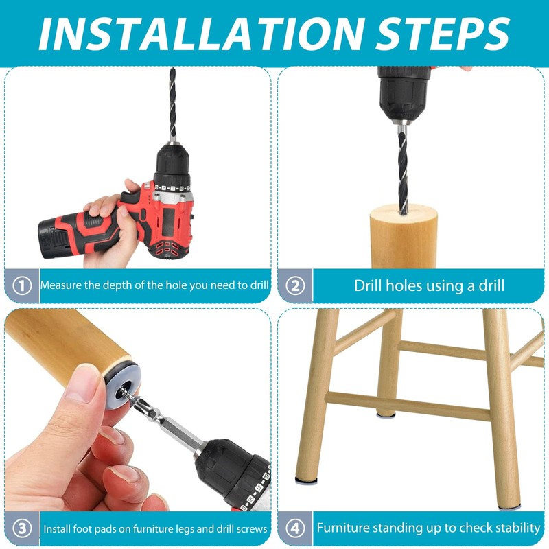 - Quantity and size: there are a total of 36 furniture gliders, 36 stainless steel screws and 2 drills. Furniture glides have a diameter of 19 mm. The screw size is: 7 x 16 mm.