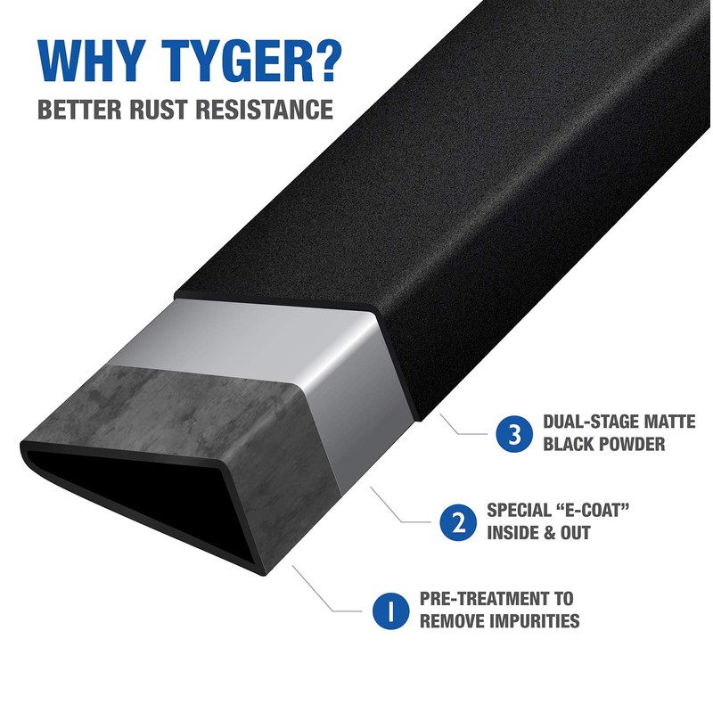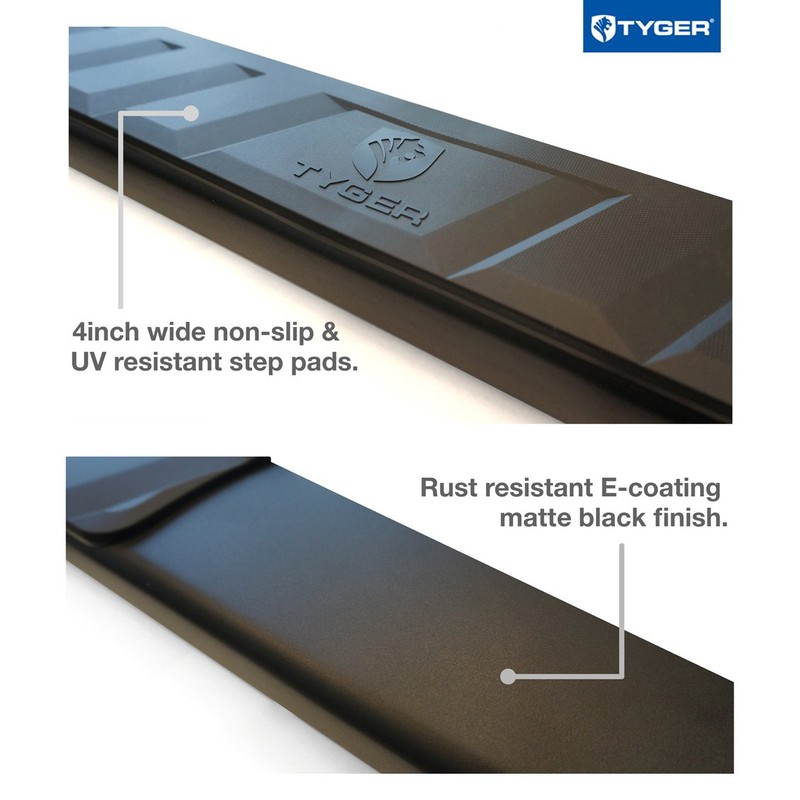 • Step bars are made of 4inch wide heavy duty triangle mild steel tubing in black Powder-Coating for rust-resistant with UV resistant non-slip wide step pads while providing extra protection to your vehicle.
